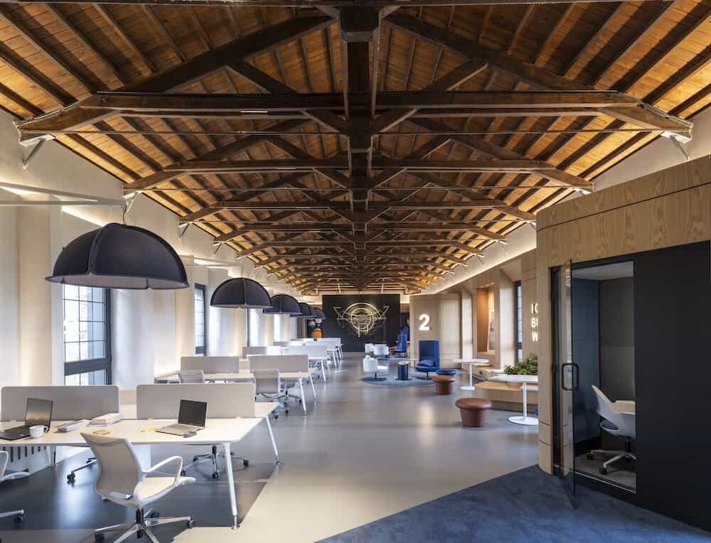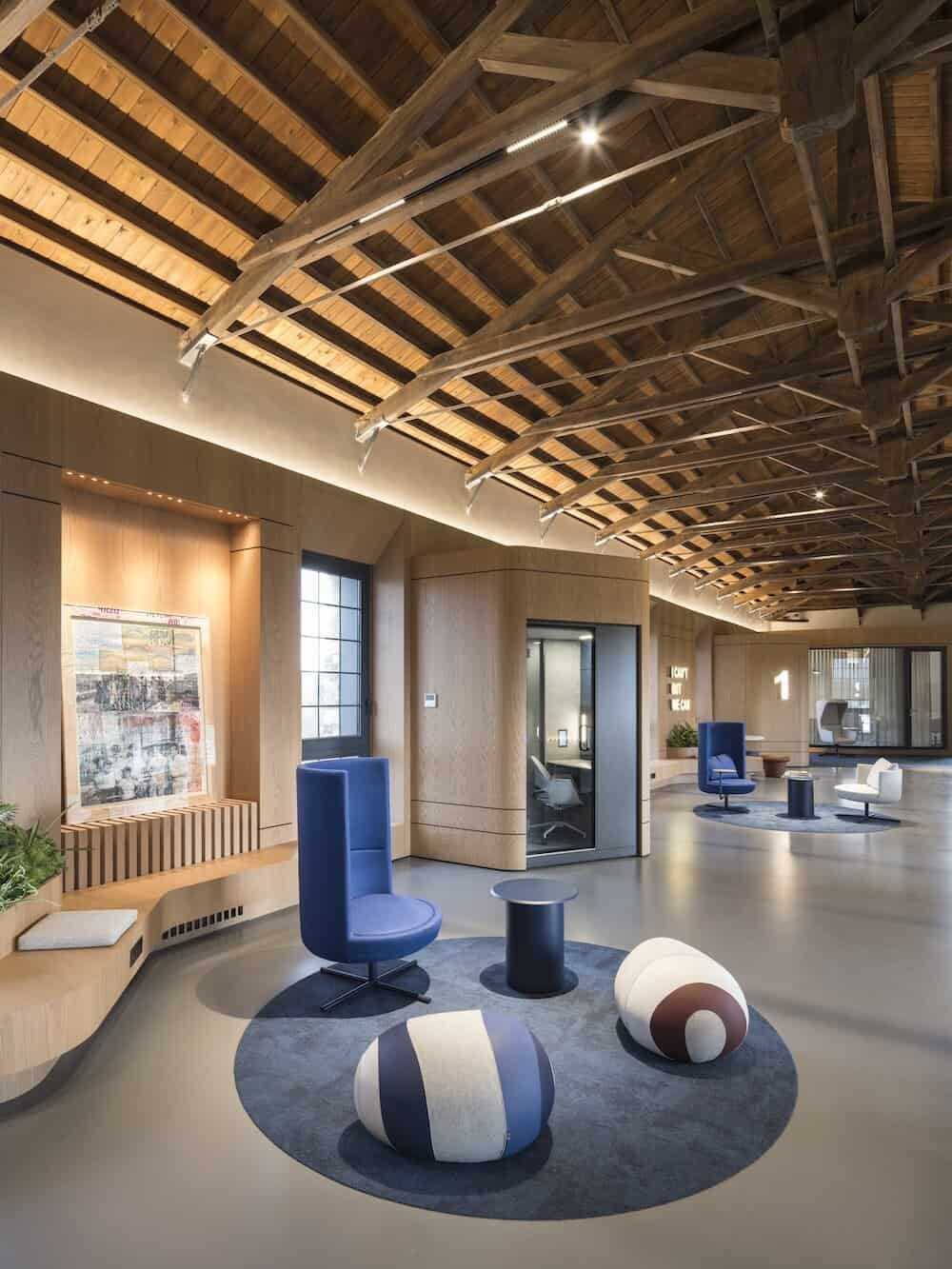 Açık ofis alanında binanın tarihi dokusunu öne çıkaran ahşap çatıyı vurgulamak için çeperdeki mobilyalara gizli ışık detayı yapıldı. Bu tasarım ortama ambiyans aydınlatması sağlarken, masalarda yeterli ışık seviyesine ulaşmak için akustik sarkıtlar kullanıldı. Aynı zamanda çatı makaslarına özel detaylarla yerleştirilen, ihtiyaca göre değişebilen 48V ray ürünler eklenerek, aydınlatma; çatının kendisiyle birlikte hareket eden bir tasarım unsuru haline getirildi. Tarihi saate yapılan vurgu ile yapının tarihi, iç mekana eklenen bir parça haline getirildi. Toplanma alanlarındaki yönlendirilmiş spotlar, mekanları tanımlamak için kullanıldı.